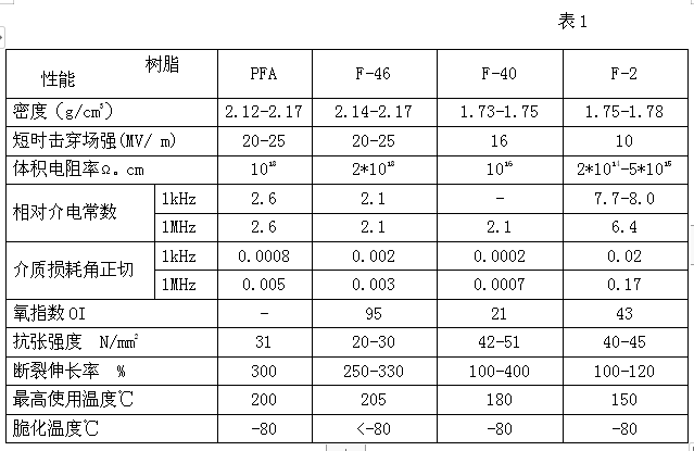 氟塑料種類有聚四氟乙烯(PTFE,簡(jiǎn)稱F-4)、四氟乙烯與全氟(正)丙基乙烯基醚的共聚物(PFA)、聚全氟乙丙烯(FEP,簡(jiǎn)稱F-46)、乙烯-四氟乙烯共聚物(ETFE,簡(jiǎn)稱 F-40)、聚偏氟乙烯(PVDF,簡(jiǎn)稱F-2)、聚三氟氯乙烯(PCTFE)、聚氟乙烯(PVF)、四氟乙烯-六氟丙烯-偏氟乙烯的共聚物(THV)等。氟塑料中F-4但綜合性能最好,但加工困難,通常用于電力電纜的有PFA、F-46、F-40、F-2等.材料的電氣機(jī)械性能如表1所示。