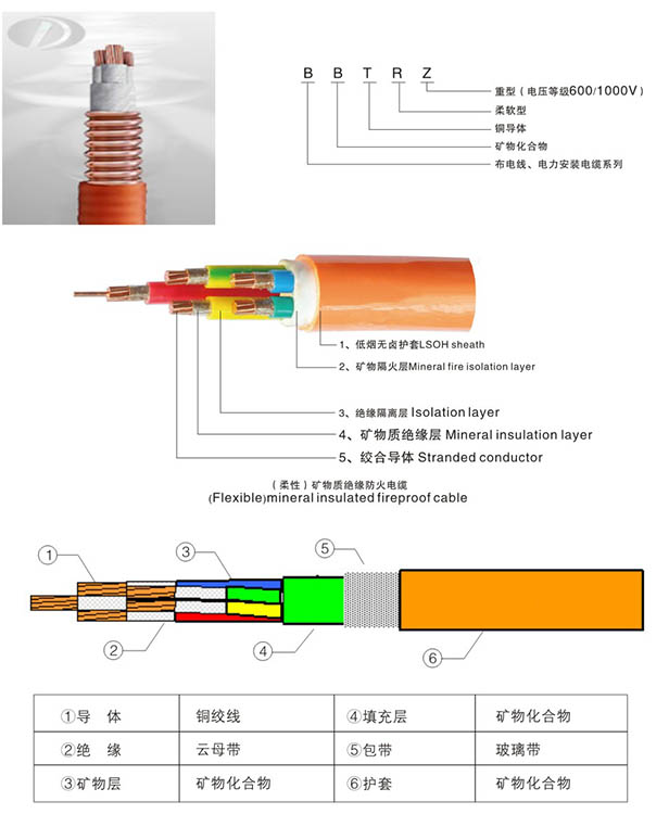 相對傳統(tǒng)的BTTZ剛性礦物絕緣電纜, BBTRZ柔性礦物絕緣電纜是由銅絞線、礦物化合物絕緣、和礦物化合物護(hù)套所構(gòu)成。其采用柔性結(jié)構(gòu),主要材料均采用無機(jī)材料,彌補(bǔ)了結(jié)構(gòu)硬、易燃燒、有毒等缺陷,并且具有一些其他電纜不具有的優(yōu)點(diǎn),如:耐火、載流量大、耐沖擊電壓、耐機(jī)械損傷、無鹵無毒、防爆、防水、耐腐蝕、壽命長、安全、耐過載、耐高溫、成本低等特點(diǎn)。